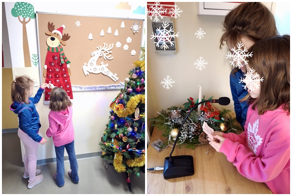 Uczniowie codziennie czytali poprzez radiowęzeł zadania z kalendarza adwentowego, w których pojawiały się dobre myśli, życzliwe słowa oraz pozytywne zadania na każdy dzień. Co robiliśmy? „Uśmiech jest dobry na wszystko. Rozejrzyjcie się dookoła i uśmiechnijcie do siebie nawzajem”, „Dobre słowo nic nie kosztuje. Powiedz coś miłego osobie z prawej strony”, „Czas na przyjacielski uścisk dłoni!”. Warto powtarzać te zadania nie tylko w świątecznym czasie!