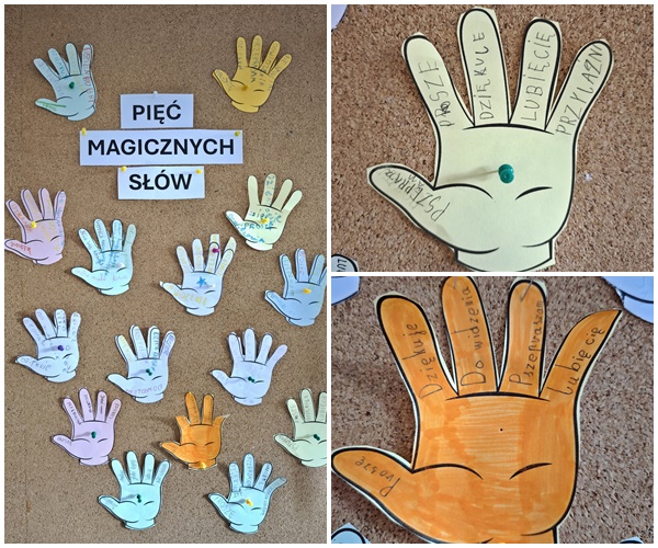 W ramach tej aktywności uczniowie utrwalali i promowali stosowanie zwrotów grzecznościowych, podkreślając ich znaczenie w codziennych relacjach i budowaniu miłej atmosfery w szkole. Wykonali gazetkę ścienną złożoną z kolorowych dłoni, na których zapisali miłe i dobre słowa.