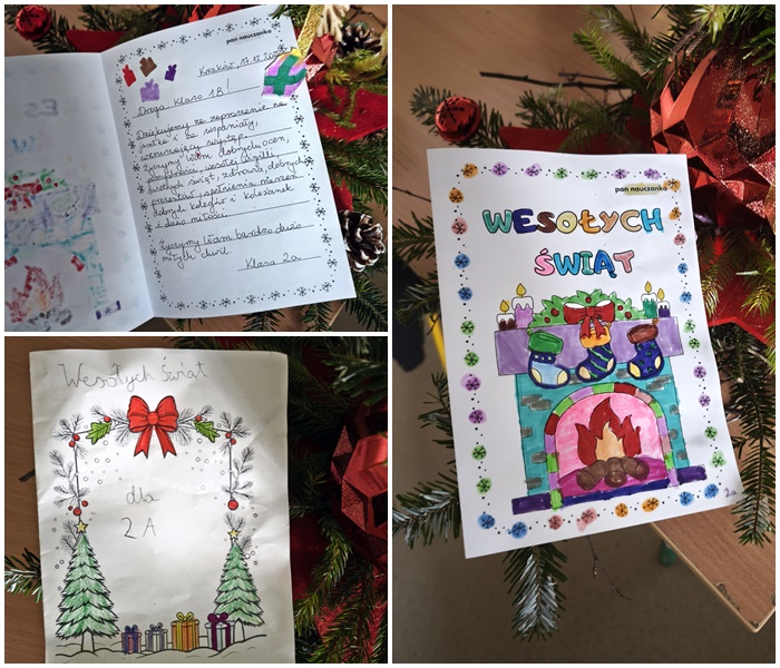 Uczniowie przygotowywali świąteczne kartki z życzeniami, które następnie przekazywali innym klasom, dzieląc się dobrym słowem i wprowadzając świąteczny, serdeczny nastrój w całej społeczności szkolnej.