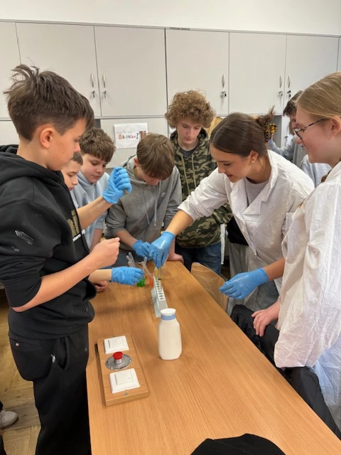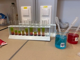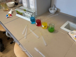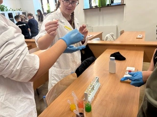 Uczniowie samodzielnie wykonywali ciekawe doświadczenia, takie jak efektowna tęcza w probówce, badali napięcie powierzchniowe, obserwowali właściwości cieczy nieniutonowskiej, określali skalę pH różnych substancji oraz obserwowali proces oddychania komórkowego.