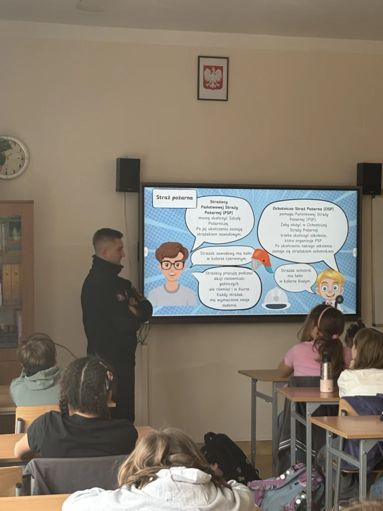 Wielu uczniów marzy o tym, aby w przyszłości zostać strażakiem. Dlatego spotkanie z prawdziwym strażakiem w naszej szkole wzbudziło ogromne zainteresowanie. Gość opowiedział uczniom klas czwartych, na czym polega jego odpowiedzialna i wymagająca praca oraz jak wygląda codzienna służba w straży pożarnej.