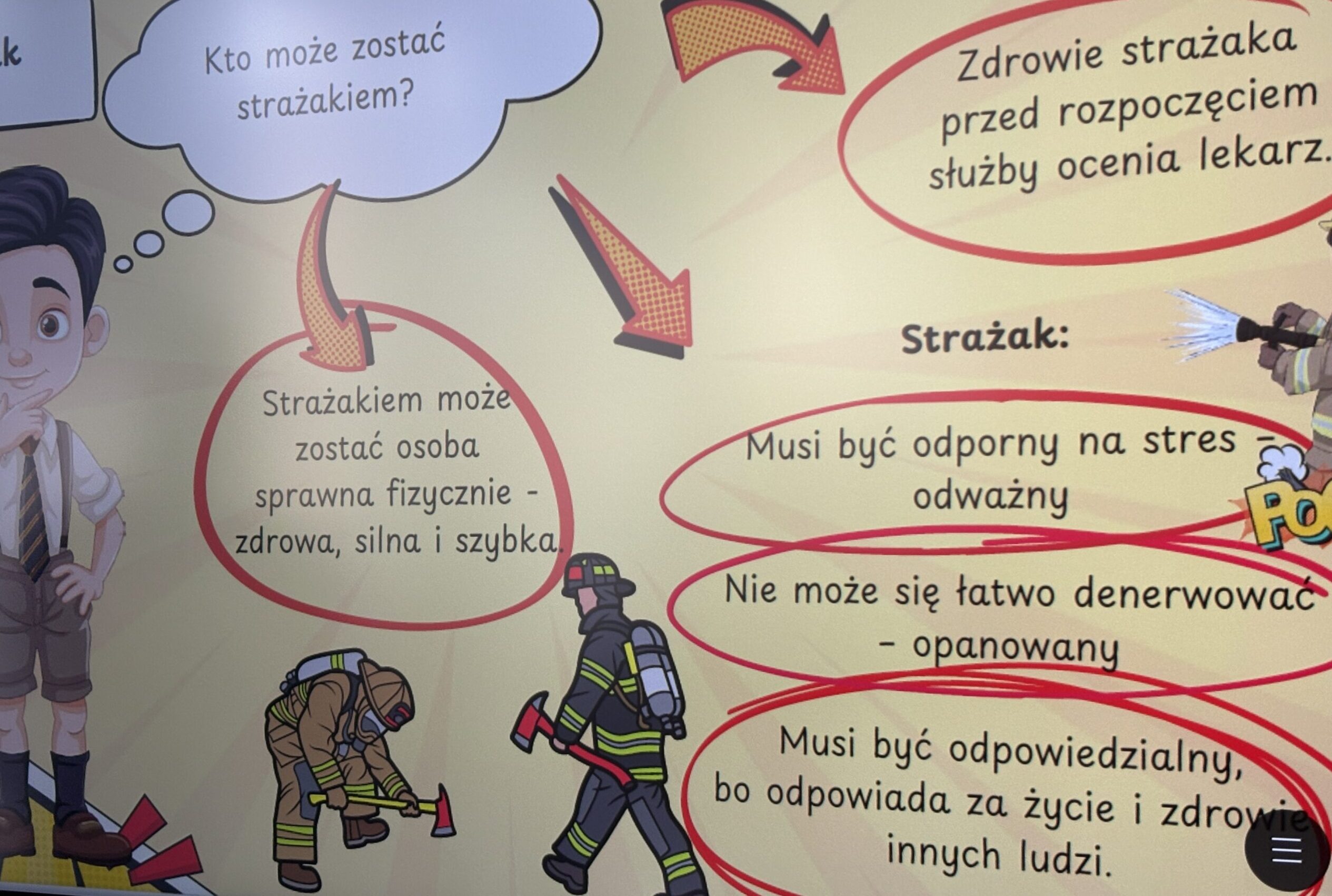 Uczniowie mogli zobaczyć prawdziwą kartę strażacką, a także dowiedzieć się, jak długo trwa służba strażaka, dlaczego