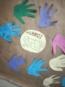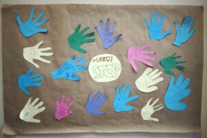 Uczniowie przygotowali również plakat „Stop agresji”. Uczniowie wskazywali sposoby reagowania na przemoc słowną i promowali zasady szacunku wobec innych. Odciski dłoni były zobowiązaniem uczniów do przestrzegania tych zasad.