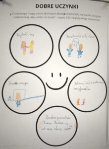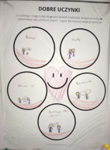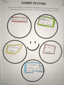 Kolejną inicjatywą były karty pracy „Dobre Uczynki”. Uczniowie uzupełniali je, opisując własne działania na rzecz innych osób. Zadanie to sprzyjało refleksji nad codzienną pomocą i wzmacniało postawy empatii.