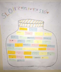 Pierwszym działaniem było przygotowanie plakatu „Słoik Dobrych Słów”, który zachęcał uczniów do dzielenia się miłymi komunikatami i pozytywnymi hasłami. Uczniowie mogli dopisywać dobre słowa, które następnie tworzyły wspólną przestrzeń życzliwości.