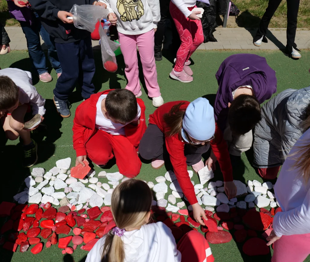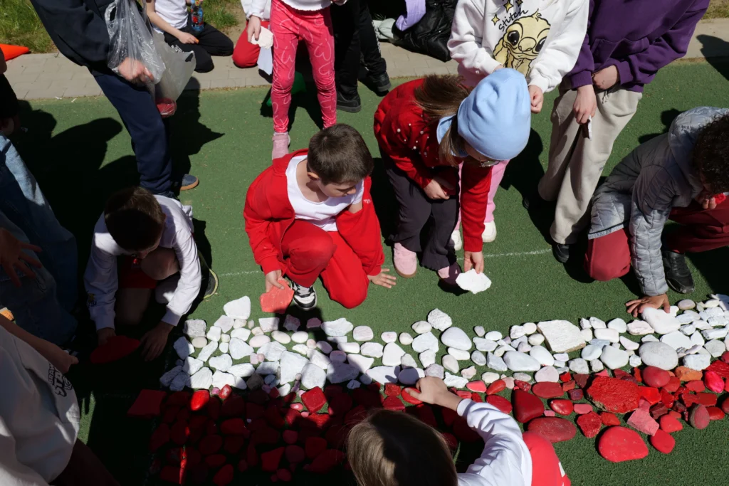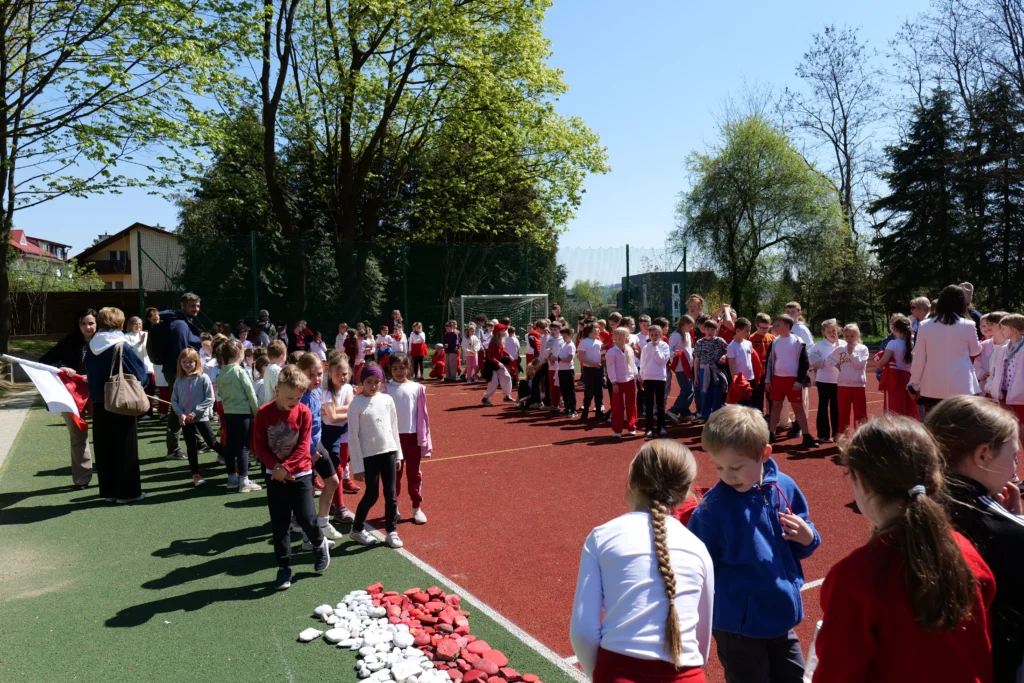 Na zakończenie obchodów wszystkie klasy z przygotowanych wcześniej kamieni ułożyli flagę narodową i odśpiewali hymn.